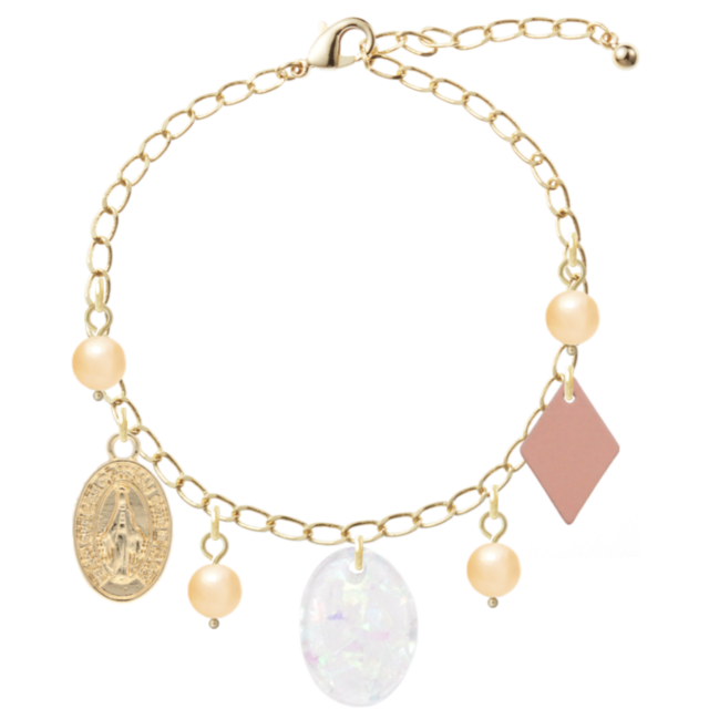 大きなチャームの周りを様々な華やかなチャ-ムが彩る煌びやかなブレスレットです。