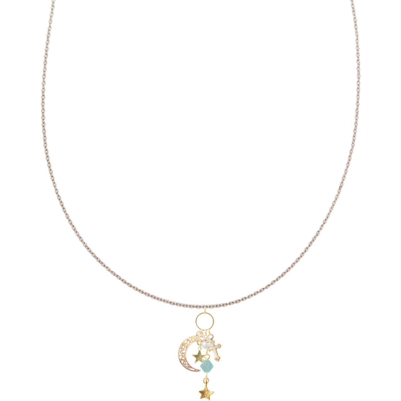 華やかな月 星のチャ-ムが胸元で揺れる煌びやかなネックレスです。