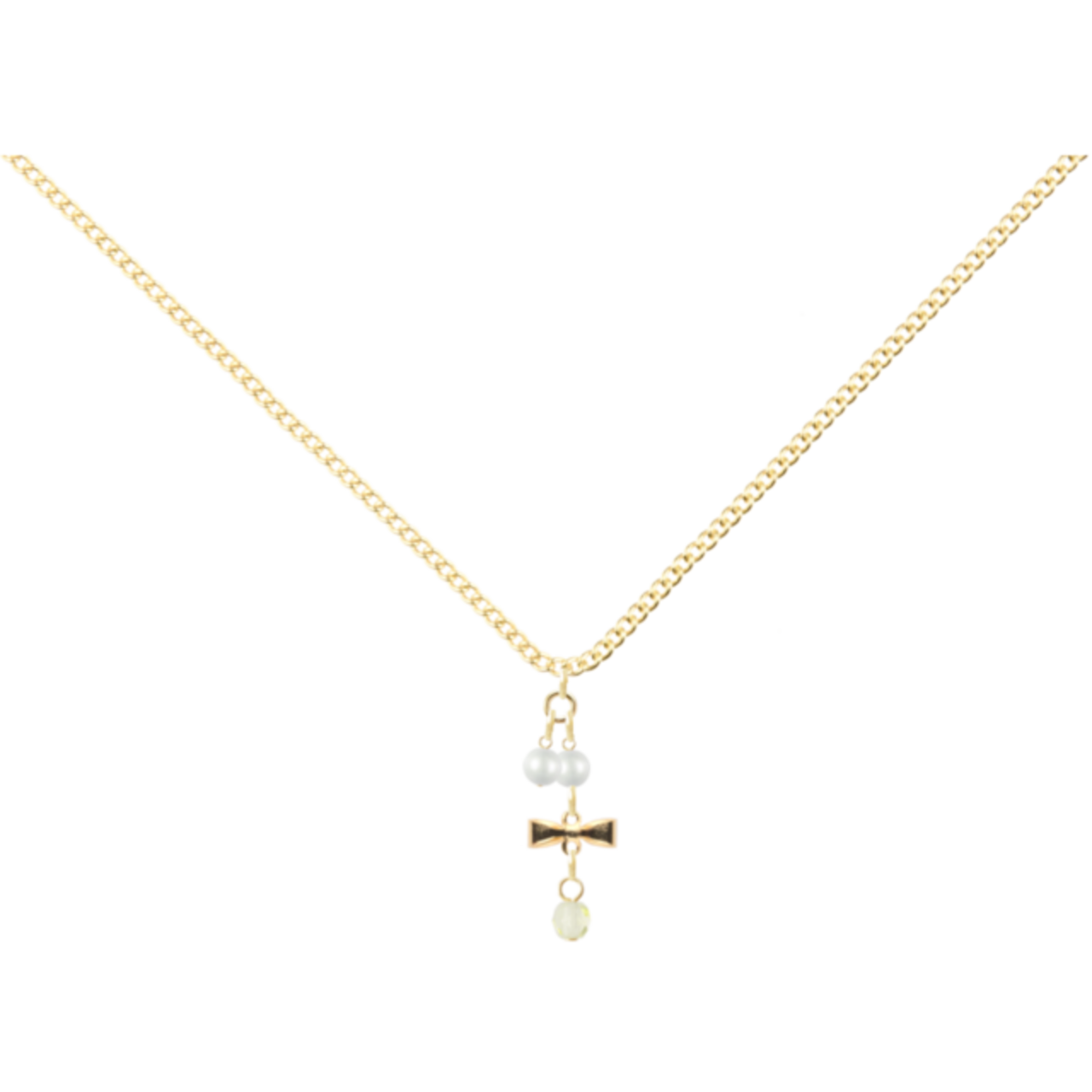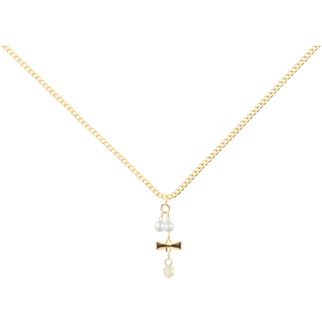 可憐なブラックリボンモチーフと輝く樹脂パールが特徴のネックレスです。華やかな装いにぴったりマッチします。日常のシンプルなコーディネートにも、アクセントとしても活躍します。