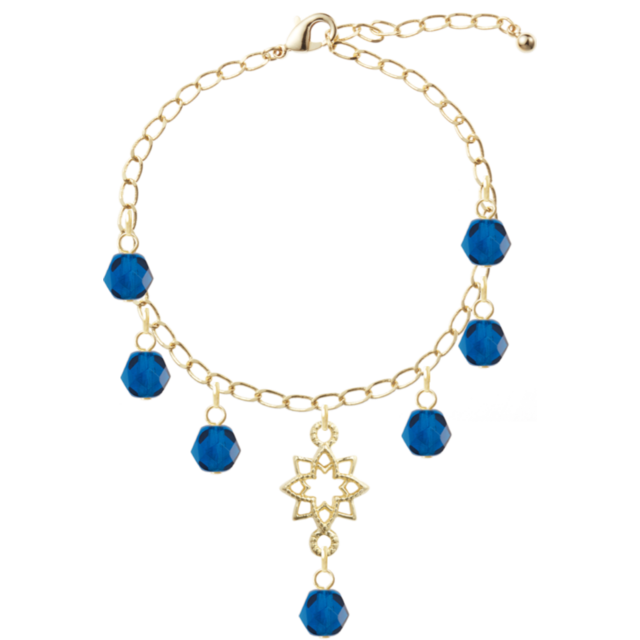 キラキラと光るチャームが目を引くブレスレット。周りを囲むチェコビーズのブルーが、より一層華やかさを引き立てます。