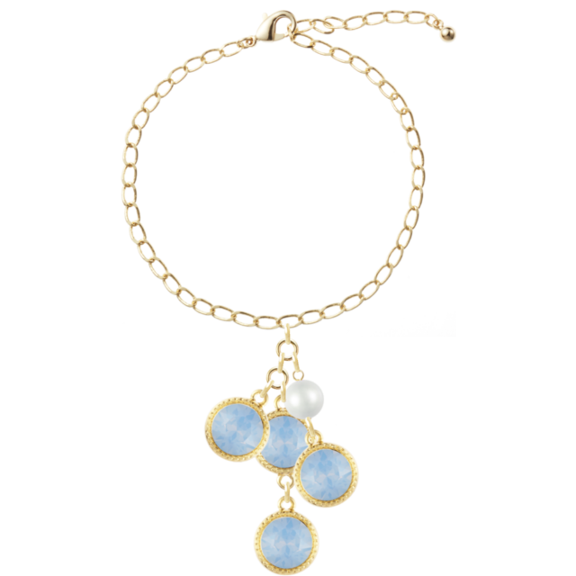 エアーブルーの華やかな色の存在感のあるエレガントなブレスレットです。手首をやさしく包み込むようなデザインで、装着するだけで手元が一気に華やかになります。