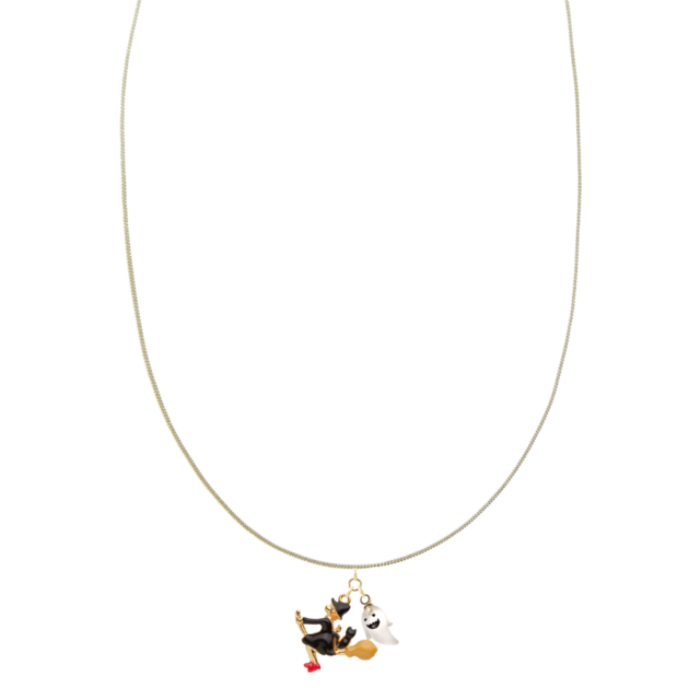 魔女とお化けのキュ-トなチャ-ムが胸元で揺れる遊び心たっぷりのネックレスです。