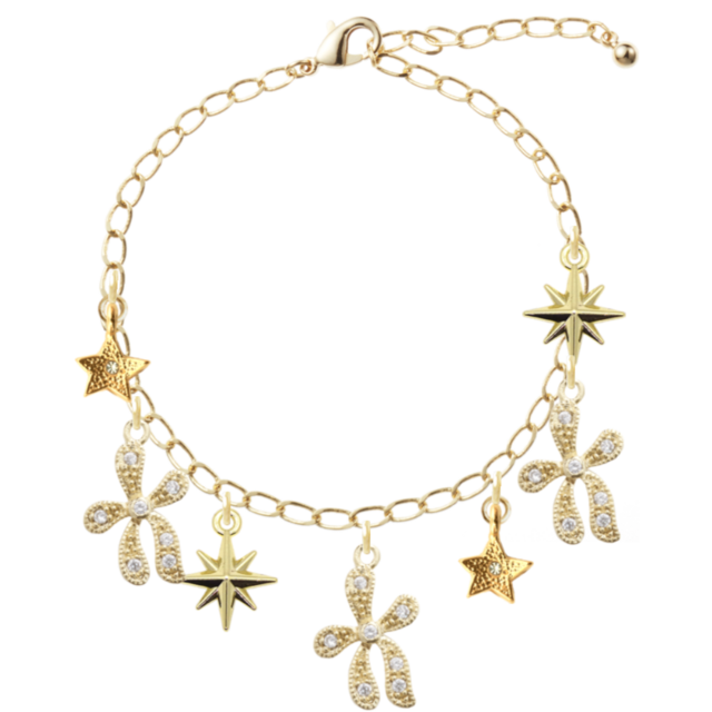 リボンフラワーパーツx3 キヘイチェーンブレスレット 小x1 キラキラプチチャームx2 キャストチャーム星x2 幾つものキラキラと煌めくチャ-ムのキュ-トなブレスレットです。