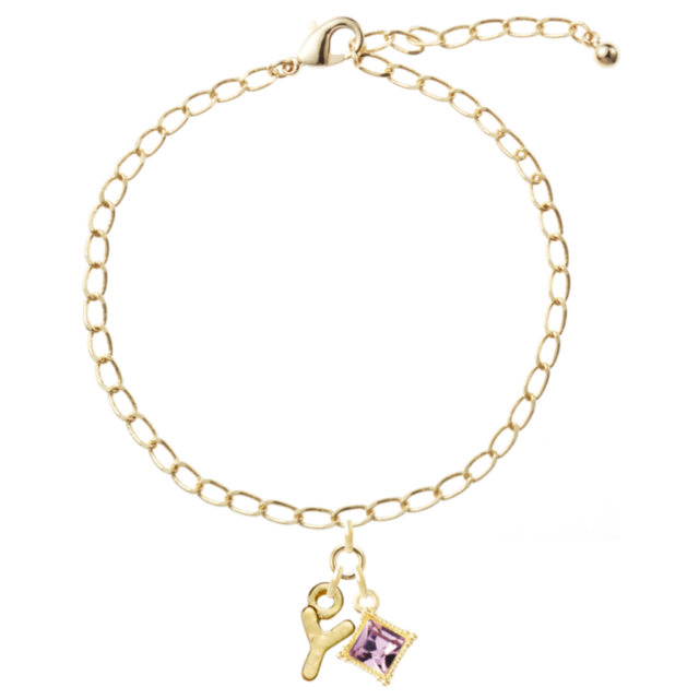 煌びやかなスワロフスキースクエアアメジストとイニシャルチャ-ムが揺れるブレスレットです。