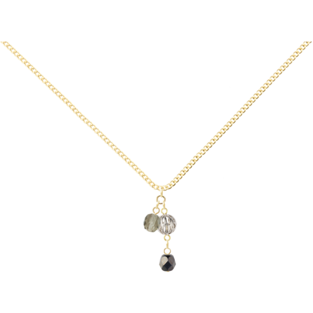 シックなカラ-のチェコビ-ズと透かしデザインボ-ルシルバーの煌めくエレガントなネックレスです。