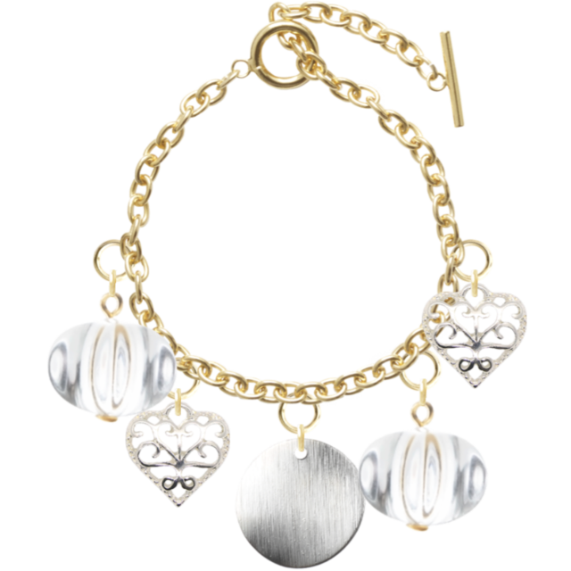 変形キューブクリアX2 小さなハートの透かしチャームシルバーx2 チャームブレスレットx1 メタルプレートシルバーx1 大きなチャ-ムが揺れる華やかでエレガントなブレスレットです。