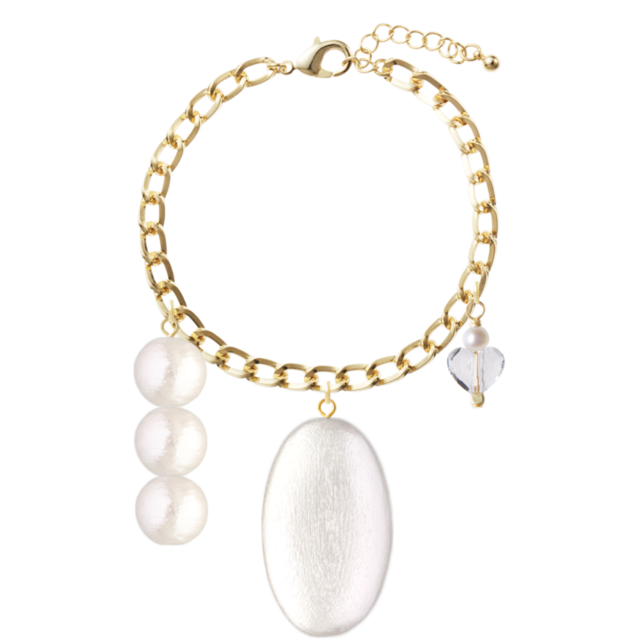 ホワイトカラ-の大きなチャ-ムと、パール系チャ-ム、クリスタルチャ-ムが腕元で揺れるシンプル華やかなブレスレットです。